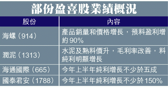 四隻報喜的水泥股中,以海螺預告盈利增長90%最耀眼,即半年盈利可高逾58億元人民幣,雖然股份在翌日即狂升5.6%,惟截至上周三止累計升幅已收窄至約3%,預告純利增長達40%的亞泥,盈喜後累計升幅僅約2%,意味只稍微跑贏大市,兩者相對4月時高位仍潛水兩成,升勢隨時有餘未盡。