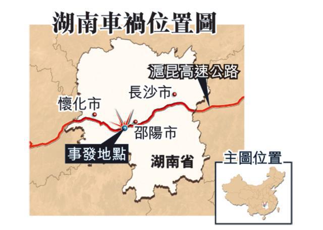 昨日凌晨3時許,滬昆高速邵懷段1,309公里處(邵陽市隆回縣)由東往西方向,一輛載有火酒的小貨車,與一輛旅遊巴追尾後發生爆炸及起火。爆炸威力驚人,不少村民在睡夢中被嚇醒,但因火勢猛烈無法第一時間滅火及施救,有目擊村民被沖天烈燄所嚇倒:「火好大,起碼有10多米高,同時還有放炮般的聲音!」現場瀰漫一股刺鼻的燒膠味,四名旅遊巴乘客從火海中逃出生天,沿途高呼救命,但全身被燒得一絲不掛,其中三人證實九成皮膚被燒傷,傷勢危殆。