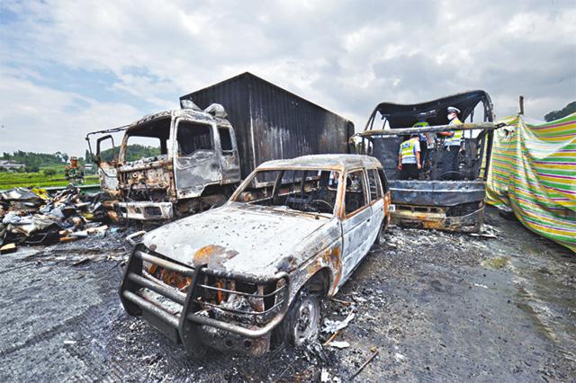 隨着兩車追尾起火,三輛車閃避不及受牽連,統統起火。五車最終被燒剩車架,其中兩輛分別運送快遞及皮鞋的貨車,貨物散落一地,疑裝易燃液體的小貨車亦被燒至空無一物。警方通報,車禍釀成43人死亡、6人受傷,其中41人遇難的旅遊巴,車內共載55人,兩人是兒童,另兩人分別是姓彭及姓賈司機,四名乘客逃出但嚴重燒傷。該旅遊巴隸屬福建莆田汽車運輸公司,前日早上7時許由福建莆田開出,目的地是四川宜賓市,現場另有一輛車共兩人遇難,車禍中不少死者已被燒得面目全非難以辨認,需DNA鑑定辨別身份。