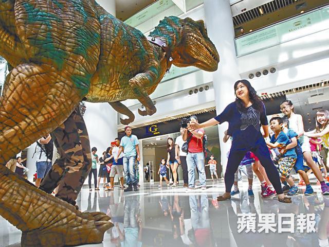 商場活動現在都「愛鬥大」,10米高達、100隻多啦A夢……不過一切都只是可遠觀而不可褻玩焉;時值下午3點,逛商場的人不太多,記者走進奧海城的「We嘩!充氣嘉年華@奧海城之與龍同行」發佈會,當主辦單位表示會將仿真度極高的恐龍costume隨時放出來陪遊人shopping時,即時第一個反應是,不怕嚇着途人嗎?說時遲那時快,後尾枕已聽見恐龍的咆哮聲,看着兩米多高的「小」暴龍對着小朋友張開血盤大口,膽大的男孩子當然開心,膽小的便嚇到瑟縮在媽媽懷裏,途人……當然是拿相機出來拍照了!