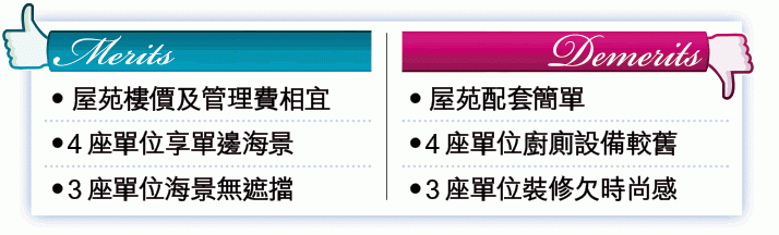 屋苑只有4座,約半數單位為兩房戶,大部份採用眼鏡房間隔,1座A及H室屬呂字廳大細房設計。三房單位包括三房一廁、三房連貯物房及三房連套房間隔,吸納不同類型換樓客。