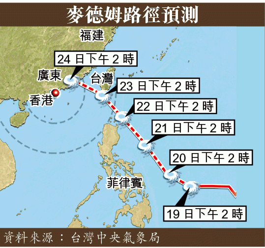 據台灣中央氣象局發佈,麥德姆已於下午2時轉強為中颱風,但轉為強颱風的機率極低。颱風移動路徑不變,但是否侵襲台灣,取決於其明日的走向。據預測,它會繼續朝台灣東部海域接近,周三(23日)下午最接近台灣南端,有機會成為今年首個襲台的颱風。屆時全台會降大雨。