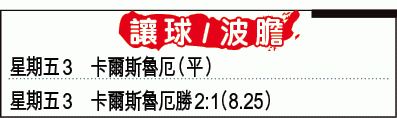 卡軍實力似乎比FSV法蘭克福勝一籌,而且上季於聯賽對賽未輸過,主場打和3:3,作客則贏1:0,因此他們有力從法蘭克福贏波而回,平手值捧。文:青蛙仔