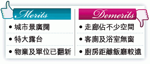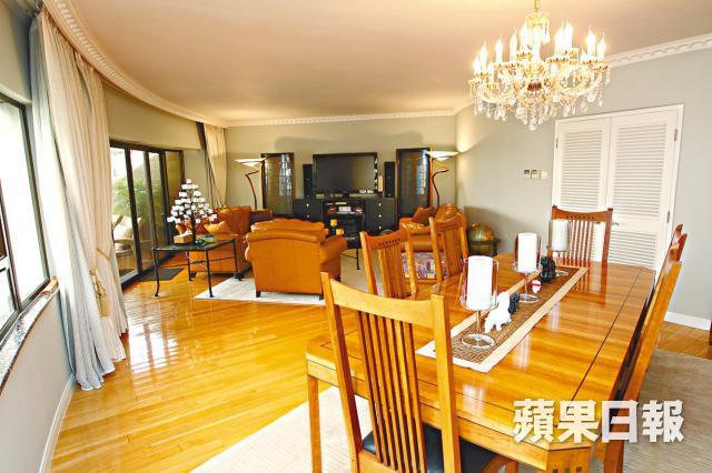 走訪中層B室,開價5,500萬元,採用弧形開則,大門靠邊沿通道往各區,客飯廳在中心處,地方是最大,陳設多組西式古典家具,佈局雅致。飯廳一壁鋪鏡,增加空間感,亦同時將窗外景致反映入室。欲看清美景,到客廳對出露台逛逛,露台呈正方形,三邊景致遼闊,得見中半山屋苑、綠樹及網球場、中西區至灣仔市景,遠眺西九龍少海景,側望會展對出部份維港。除倚欄觀景,偌大的露台可擺放四組藤製梳化及卧椅,一家數口或三五知己在此嘆茶聊天,亦是賞心樂事。