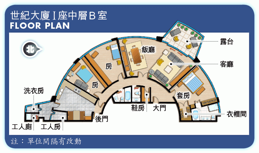 間隔:3房(1套連衣帽間)2廳;另露台、工人房、工人廁、洗衣房及鞋房