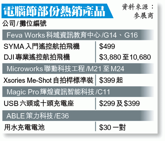科域營運總監表示,電腦節首日賣出200多部航拍機,昨上半日賣出約100部,顧客多是30至40歲男士,以買499元入門機佔多,「係大玩具店要賣成千蚊,呢部機輕身,有機翼保護罩,炒咗機都冇咁傷」。
