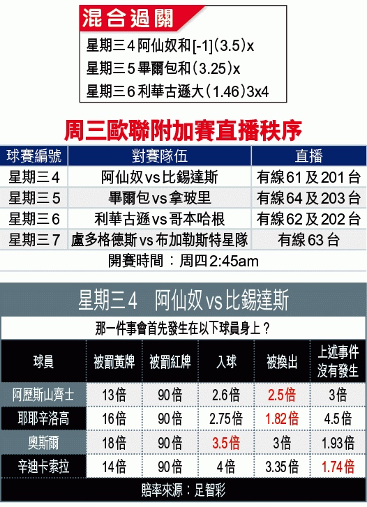 阿仙奴能否連續17年參與歐聯分組賽,還看周三附加賽次回合主場對比錫達斯一戰;雖然兵工廠有基奧特及艾朗藍斯等主力缺陣,但憑較豐富經驗,仍足以小勝晉級,「讓球主客和」取「和局」。