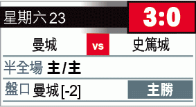 衞冕的曼城開季兩連勝,而且兩場都贏盤,周六主場對實力平平的史篤城,相信可以輕取對手。儘管尼格度肯定缺陣,迪斯高亦有傷在身,但祖維迪及阿古路狀態大勇,加上大衛施華及拿斯尼俱可披甲,今仗一於直取曼城[-2]「主勝」。