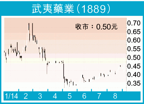藥股繼續成為市場焦點,有業績支持及併購消息尤其吃香︰中期盈利喪升22倍嘅銘源醫療(233),噚日再升半成;綠葉製業(2186)早前宣佈,收購從事降膽固醇藥及心血管業嘅嘉林藥業58%權益,股價連番創上市新高;華夏醫療(8143)擬收購內地醫院,消息一出即彈16%。今日推介嘅武夷藥業(1889),中期業績見紅,又未聞有併購消息,但竟狂升18%,究竟所謂何事呢?