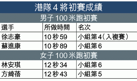 另外,香港「百米女飛人」方綺蓓及林安琪,昨在女子100米預賽分別跑出12秒43及12秒34,雙雙無緣晉級。至於中國的兩位代表就輕鬆晉級,與徐志豪同組、最佳時間為10秒正的張培萌跑出10秒27,以小組次名晉身準決賽,日本名將山縣亮太就得首名;而蘇炳添就在第2組跑出10秒35,落後亞洲紀錄保持者、卡塔爾的法蘭斯,以次名晉級。