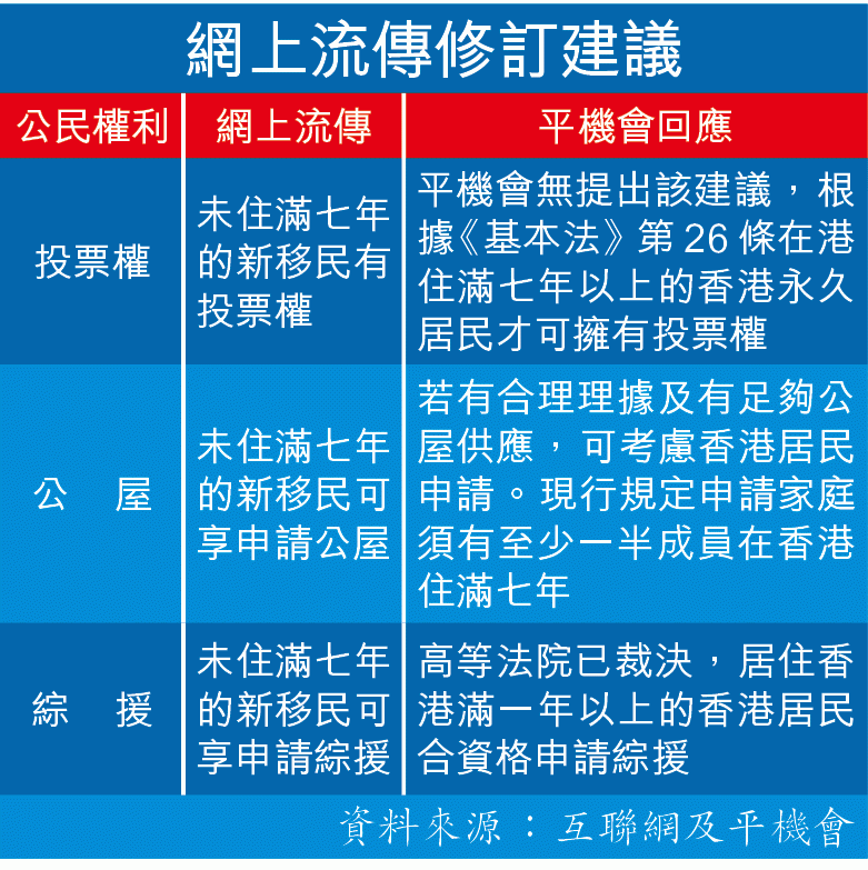平機會發言人向本報澄清,並無建議讓新來港人士享有投票權,「《基本法》早已規定永久居民才有投票權」。福利方面,平機會認為若有合理理據下,可考慮以香港居民作為申請資格 ,「例如綜援,法庭已裁決只需住滿一年就可申請」。