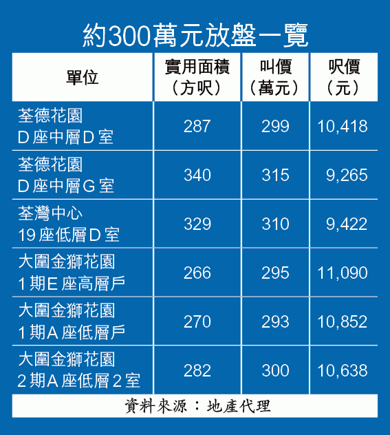 另外,大圍區兩個新居屋,合共約500伙,目前該區300萬元以下放盤量則屈指可數,其中實用率奇低的大圍金獅花園現有約5個三球以下放盤,叫價最平為1期A座低層戶,實用270方呎,叫價293萬元,呎價10,852元。