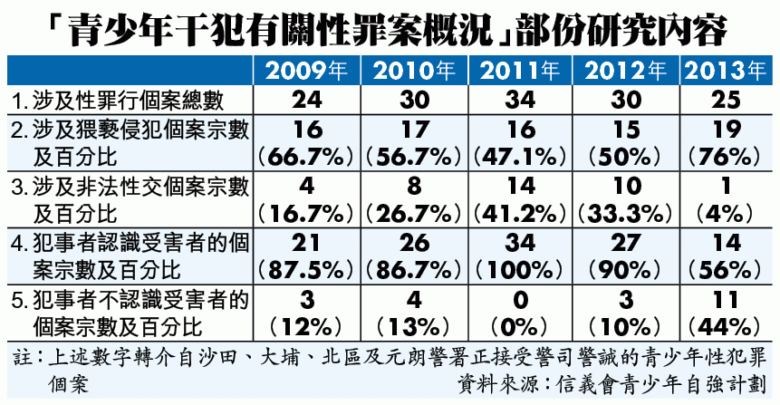 信義會第5年進行「青少年干犯有關性罪行概況研究」,分析轉介自沙田、大埔、北區及元朗警署正接受警司警誡的個案,去年共有25宗涉及青少年性罪行,涉案者年齡介乎12至17歲,整體個案較去年減少16.6%,但當中19宗涉及非禮,是過去5年新高,其餘涉遊蕩及非法性交等。研究顯示,去年有11宗性犯罪個案,犯事者與受害人互不相識,佔整體個案44%,較往年平均僅9%為高。