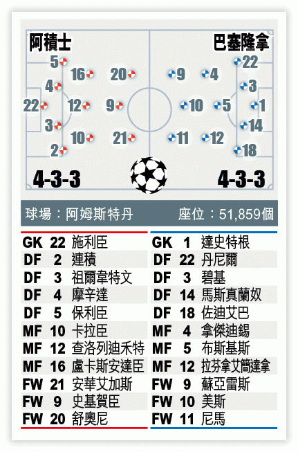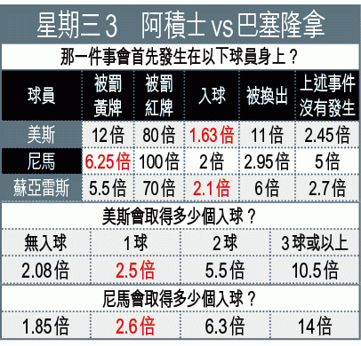 往績上阿積士也不差,兩年前分組賽就主場2:1擊敗巴塞,另荷蘭球隊自96年後,未嘗主場不敵巴塞,故阿積士今仗就算未必能搶分,也有力攻破客軍大門,「大細」中位數縱定於3.5球,入球「大」仍可追。