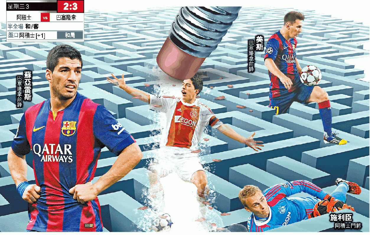 西甲勁旅巴塞隆拿罕逢兩連敗,周三歐聯分組賽作客荷蘭的阿積士,以球隊急需一吐烏氣,加上前鋒蘇亞雷斯重返成名地,理應反底在望,但巴塞後防不穩,大將馬菲奧亦缺陣,博入球「大」較為安全。(球賽編號:星期三3;有線63台明日3:45am直播)