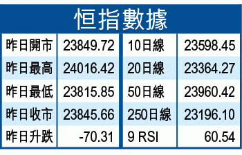 港股在24000關附近呈好淡爭持格局,恒指低開61點後,早段曾跌100點,低見23815後反彈,一度重返24000關,最多倒升101點,高見24016,其後再回軟,最終跌70點完場,收報23845,成交708億元。