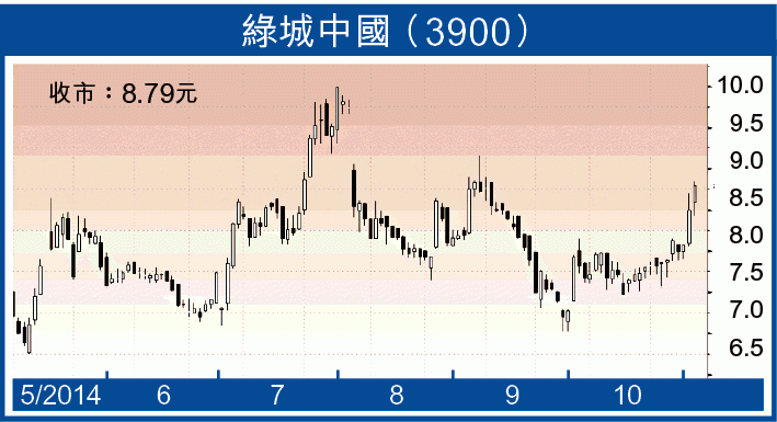 綠城中國今年初見全年高位12.44元,其後輾轉跌至5月中低位6.75元喘穩,過去兩日連日收陽燭,昨日更升抵今年降軌阻力,技術指標向好,候8.7元買入,目標10元,失守8.2元止蝕。