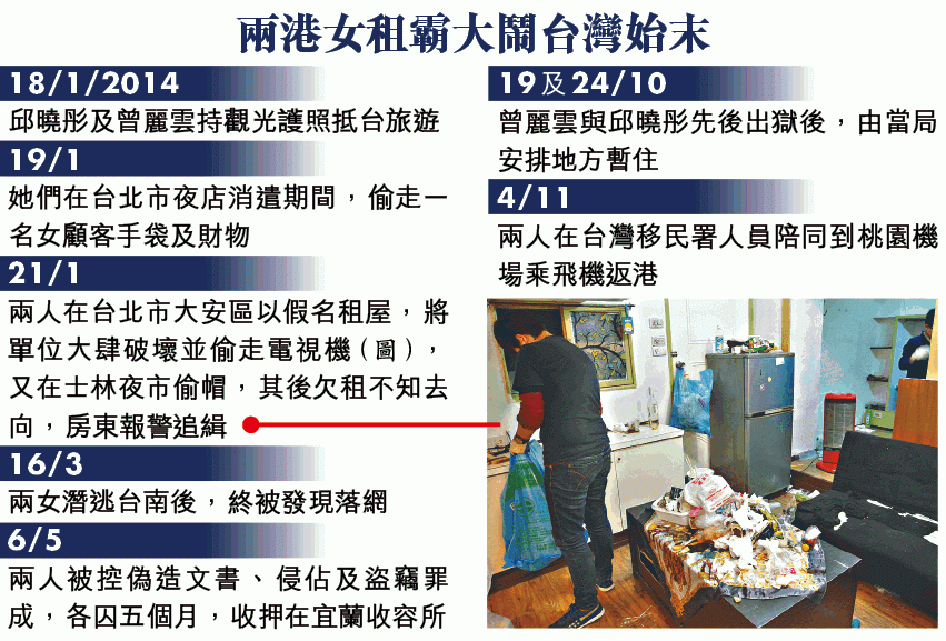 【本報訊】在台灣弄得滿城風雨的兩名港女租霸曾麗雲(20歲)及邱曉彤(19歲),上月已刑滿出獄,昨午遭遣返香港,永久不得再次申請入台。兩港女離台前透過移民署向台灣道歉,對犯下的錯誤深感懊悔。可惜港女本色不變,她們離開宜蘭收容所前要求化妝扮靚被當局拒絕後;在本港機場上又大玩變身,更換太陽眼鏡及穿上與在桃園機場不同的衣服,混在旅客中擺脫在機場守候的記者。
