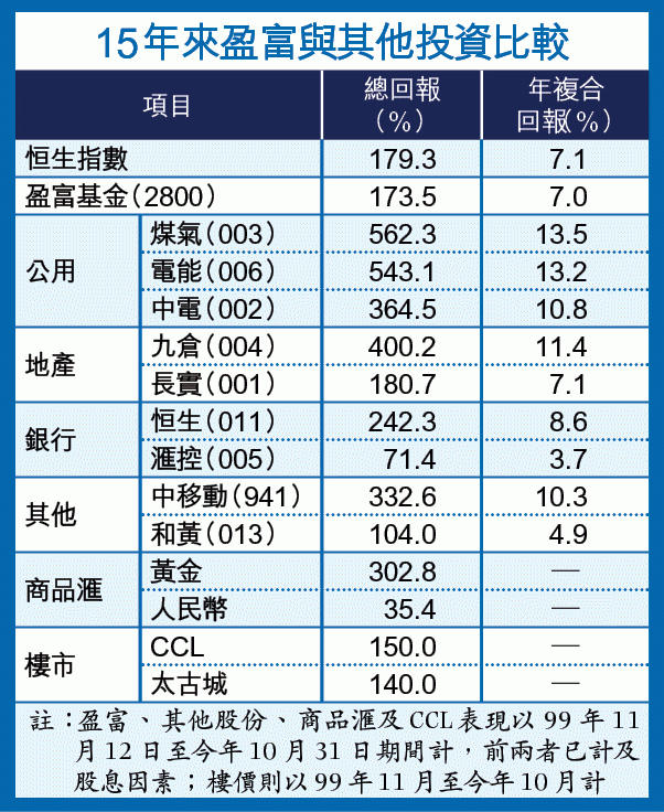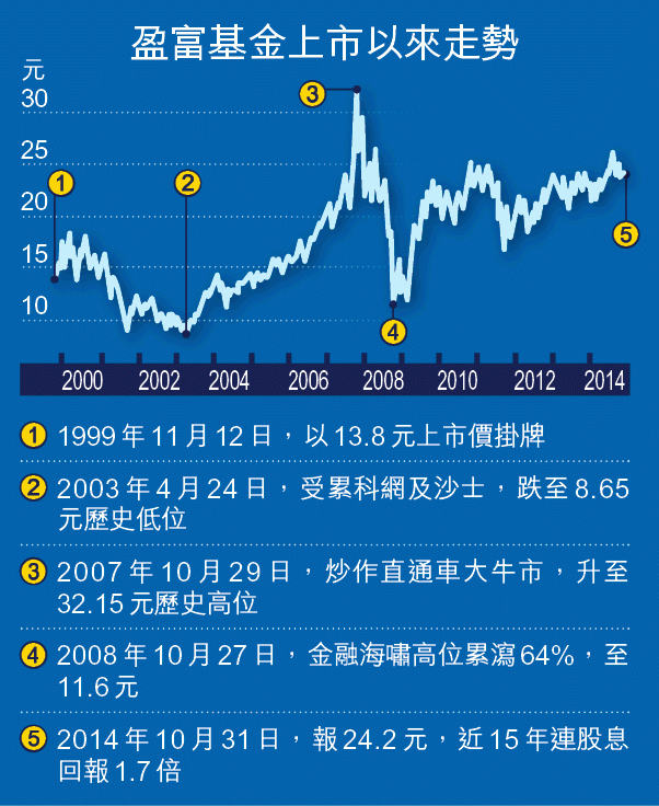 盈富於1999年11月12日以13.8元上市價掛牌,股價表現一直緊跟恒指,截至上月底止,15年股價累升約72%,連同股息的總回報則高達173.5%,每年複合回報近7厘,與恒指有0.1個百分點的誤差,資產規模由333億元倍增至600億元,表現則跑贏樓市,但跑輸商品(見另文)。