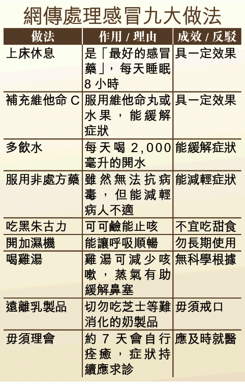 文章也提到雞湯療法,指中國幾百年來流傳飲雞湯醫感冒,能減少咳嗽,熱湯蒸氣可緩解鼻塞。不過,專家指這種說法無科學依據,患者應該避免吃雞湯等油膩食物,否則會加重症狀。文章又提到,患者感冒七天會自行痊癒,一旦症狀持續惡化應盡快求診。專家解釋,說法有它的道理,但卻非人人適用,如老人家感冒後容易發生支氣管炎和肺炎,病情惡化會導致肺部感染和呼吸衰竭,所以要時刻留意患者情況。
