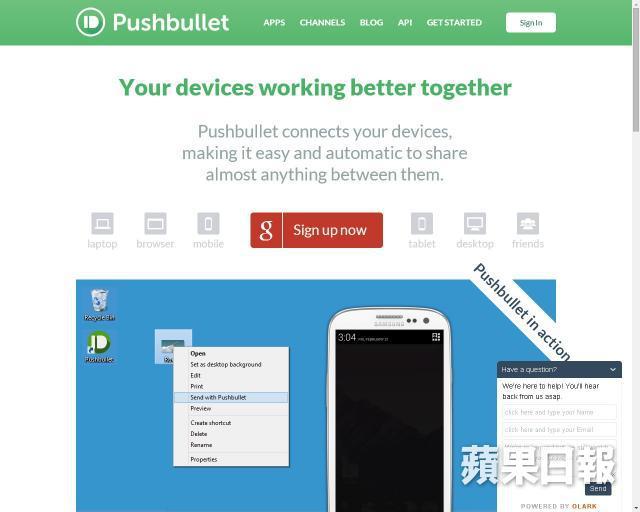 返工時將手機校作靜音模式,相信是不少上班族的基本常識,不過得閒時又要攞部手機出嚟,看看有否Miss Call或訊息,又感覺有點煩人吧!現在有一款Pushbullet軟件,只要在手機的Google Play預載,之後再在所使用的電腦同時裝上,然後分別在手機電腦上登入相同的Google賬戶,從此你手機的通知欄有任何新訊息,例如Miss Call、WhatsApp、微信、Facebook……等等的通知,你都可以透過電腦的彈出式訊息睇到了。記者: 朱崇德攝影: 伍慶泉