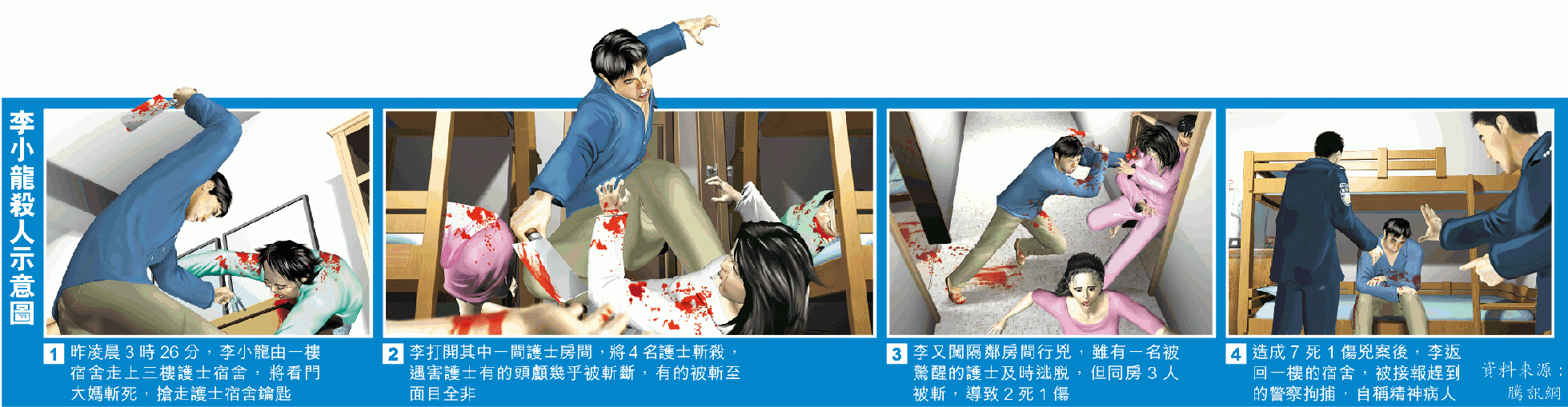 事發在北京軍區北戴河療養院(又稱281醫院),27歲疑兇李小龍為醫院食堂職工,負責切菜等工作。他與死傷者住在醫院同一棟宿舍,男女分層居住,李住一樓,女護士們則住在三樓。昨日凌晨3時26分,李突然持菜刀走上三樓,先騙50歲的看門大媽開門,將她斬死,然後搶走門匙,直闖女護士的房間。據報,李至少闖入兩間房行兇,當時每間房住了四個人。