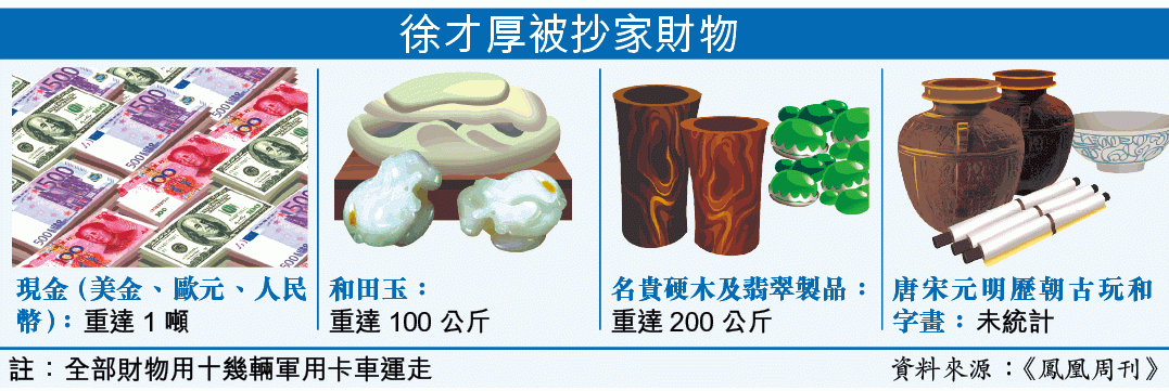 這篇題為「國賊徐才厚查抄內幕」的長篇報道披露,在徐宅倉庫裏,還有幾百公斤的和田玉、各種名貴硬木和翡翠製品一大堆。和田玉大多原封不動,有的只是去了一層外皮,露出裏面的成色,璞玉至少有十幾塊。庫內還有唐宋元明的各種古玩器具和字畫,雜亂地放在屋裏。經十幾天查抄,疲憊不堪的辦案人員列出清單,向徐出示對質。面對巨量贓款贓物,徐只得認罪。