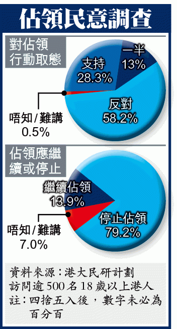 港大民研於11月19日訪問逾500名市民,結果顯示支持佔領受訪者為28.3%,與本周初同一調查結果相若,反對則上升3.5個百分點至58.2%;長遠來說,64.5%受訪市民認為佔領運動弊多於利,認為佔領好處較多僅得19.2%。