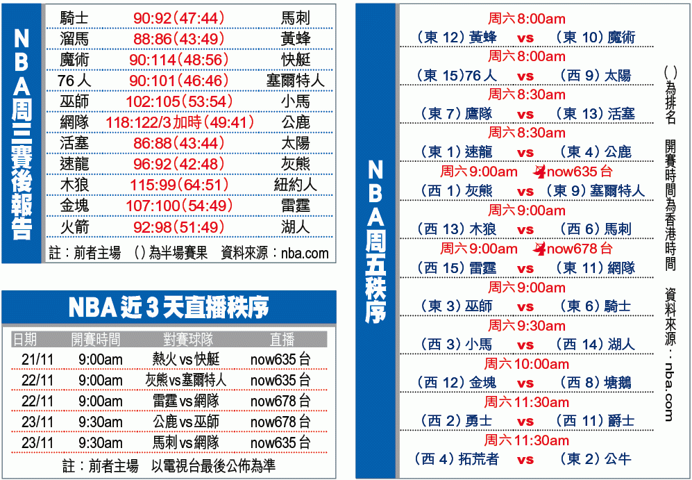 兩位在今季NBA得分最高的球員,在周三常規賽一個爭氣一個失威。湖人作客火箭有拜恩攻入29分,以98:92擊敗對手取得今季首次連勝;至於騎士的勒邦占士(圖)就在主場迎戰馬刺一戰完場前發生致命失誤,結果以90:92輸波,今季首次主場連敗。占士今場波僅入15分,射手榜榜首位置被拜恩趕過。