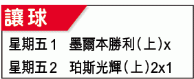 珀斯光輝今季予人驚喜,加上強陣,故周五於澳職尾場迎戰作客腳軟的威靈頓鳳凰,絕對可以秤先,讓半/一必捧上盤。(球賽編號:星期五2;有線64及203台今日6:45pm直播)