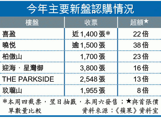 今年首張價單超額最多的新盤為恒地(012)長沙灣單幢樓曉悅,首張價單38伙,收票逾1,500票,超額38倍,北角柏傲山超額23倍第二高。由於喜盈本周四截票,以目前收票進度,預期超額倍數可超越柏傲山,挑戰曉悅紀錄。