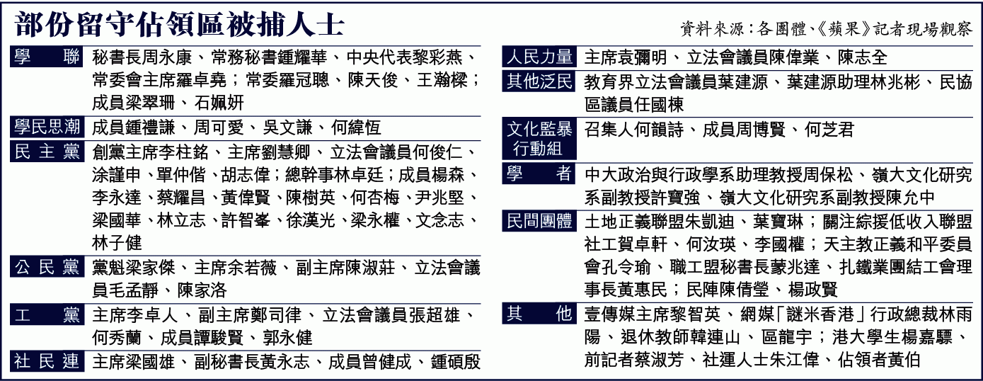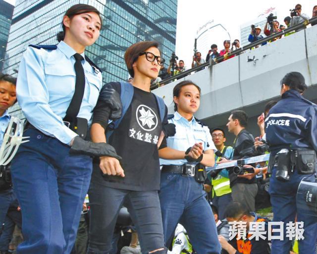 抗命者還包括三位大律師公會前主席,即民主黨創黨主席李柱銘、公民黨主席余若薇和黨魁梁家傑。壹傳媒集團主席黎智英隨後也被捕。「文化監暴」成員、歌手何韻詩微笑靜待被捕,並帶領示威者高叫「我要真普選」。警察抬人期間,有抗命者在後方高呼:「就算你拉晒我哋返去,出返嚟一定抗爭到底,直至我哋有真普選。」全場士氣大振。昨共有42泛民成員被捕,包括16名議員,學聯及學民思潮,分別有9人及4人被捕,包括一個未成年17歲學生。