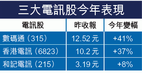 受惠加價潮,電訊股今年發力大升,截至昨日數碼通(315)、香港電訊(HKT,6823)分別較年初大升41.3%及37.5%。和記電訊(215)雖然僅升8.5%,但也跑贏恒指0.4%或102點的升幅,分析員估計,未來兩年電訊商會繼續加價,前景正面。