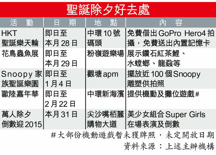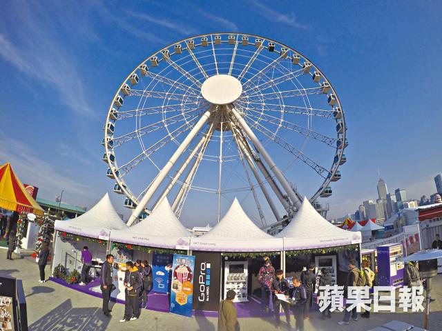中環海濱摩天輪在夜空下、寒風中緩緩轉動,傍晚時吸引逾百人排隊等候;廂座內的情侶互相依偎臉貼臉拍照,濃情聖誕滿載。運動攝影機(Action Cam)GoPro則在會場設有攤位,不但免費借出剛推出的GoPro Hero4,機內的記憶卡更會送給客人,將拍得歡樂笑靨帶回家。