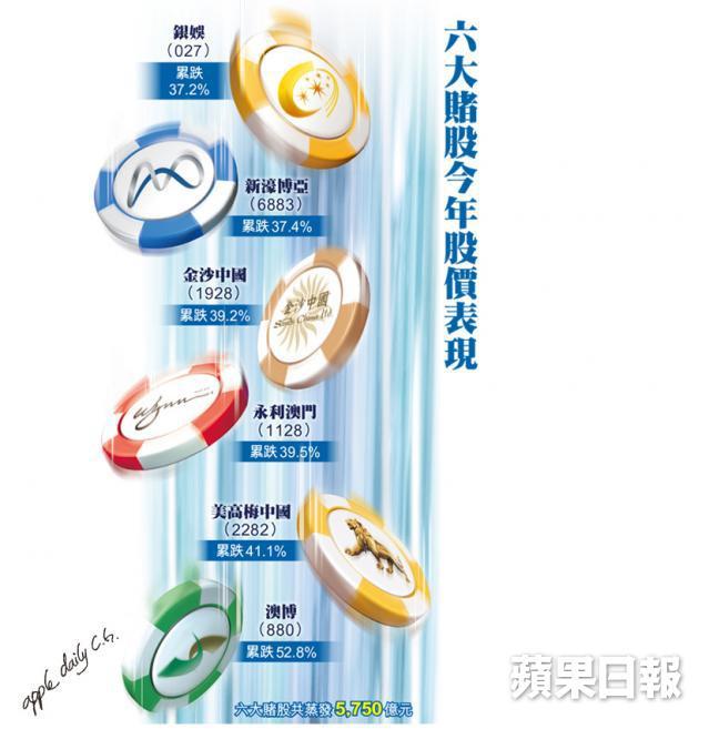 事實上,在承接2013年濠賭狂熱的盛勢,多隻濠賭股股價在今年上半年繼續處於高位,更一度造就銀娛(027)主席呂志和的身家,直逼首富李嘉誠。但隨着澳門賭收自6月起連續出現罕見的接連下跌,濠賭狂潮正式落幕,6大賭牌牌主股的市值,埋單計年內合共蒸發近5,750億元(截至上周三收市),相當於澳門近兩年賭收總和。