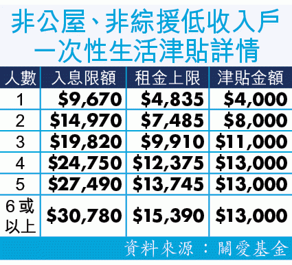 【本報訊】關愛基金再次為非公屋、非綜援的低收入住戶,即俗稱「N無人士」,發放一次性生活津貼,金額更按住戶人數調高至4,000元至13,000元不等,平均增幅約10%至14%,料5.3萬戶約12.6萬人受惠,涉及公帑約4.68億元。本周五(2日)開始分階段接受申請,最快一個月後、農曆新年前便可領取津貼。