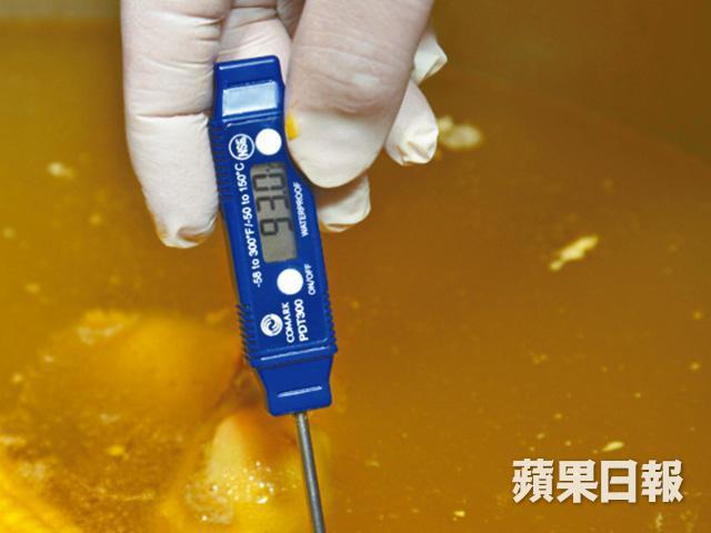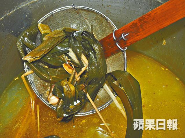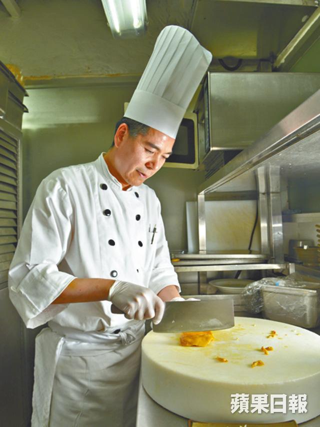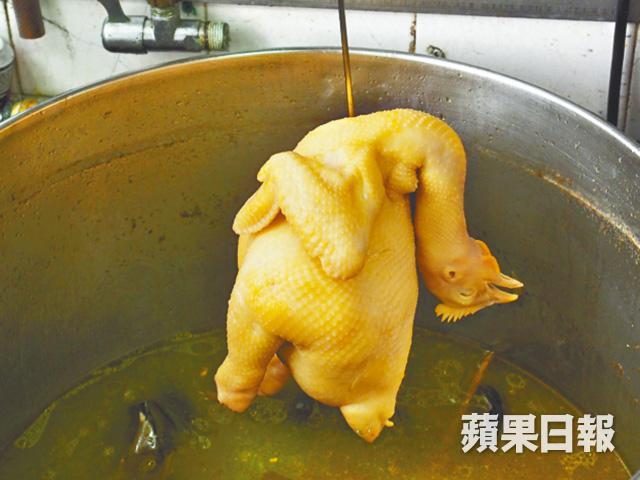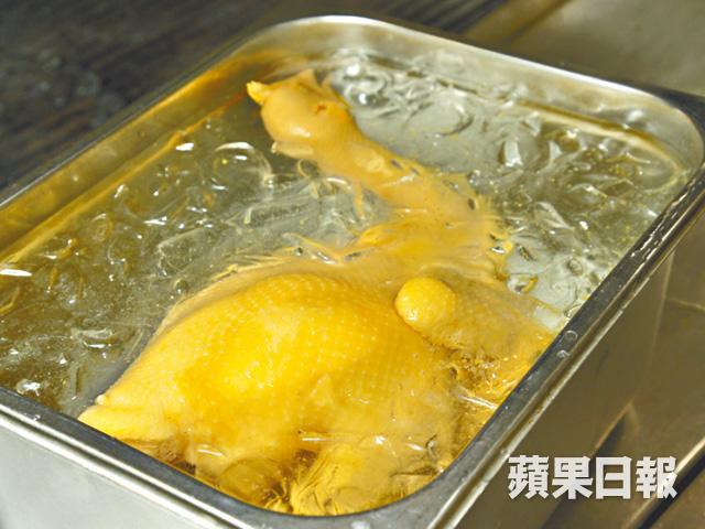 和坊間直接以白滷水浸雞做法略有不同,只見Grand Cafe的助理總廚陳偉民把雞放入攝氏90˚的雞湯浸熟,再放進冰水冷卻,然後才浸入室溫的白滷水,一隻雞差不多要花上兩個半小時才完成。「因為白滷水本身帶有香料及鹽份,若然直接浸熟雞肉,容易變嚡。」可惜因供貨問題,數年前已由新鮮嘉美雞轉為冰鮮三黃雞,但做法相同,仍做到皮爽肉嫩。