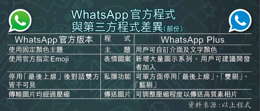 從為人詬病的「最後上線時間」及「藍剔」事件,到多年不變的綠色介面,即使有諸多不滿,WhatsApp作為港人最常用的即時通訊程式的地位依然屹立不倒。為脫離官方程式限制,不少人選擇轉用由第三方開發者推出的程式如WhatsApp Plus等繼續使用服務,惟相關程式昨日終在官方辣招下宣告死亡。