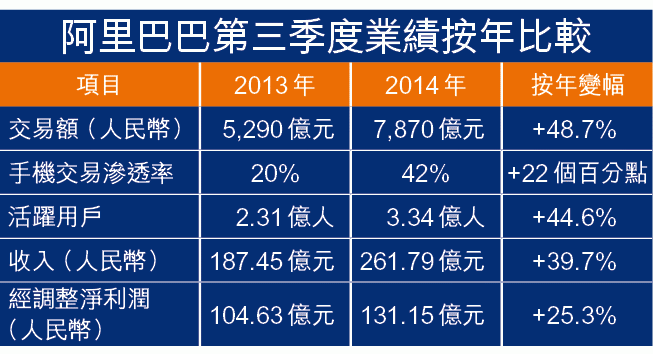 期內「雙十一」交易額達五百七十億元,創出歷史新高,令阿里第三季度的交易總額(GMV)達七千八百七十億元,按年增加48.7%。副主席蔡崇信在電話會議中表示,僅淘寶及天貓兩個平台去季交易額,已佔全中國網上交易額的86%,每月活躍用戶數量則增加44.6%,至三億三千四百萬人。
