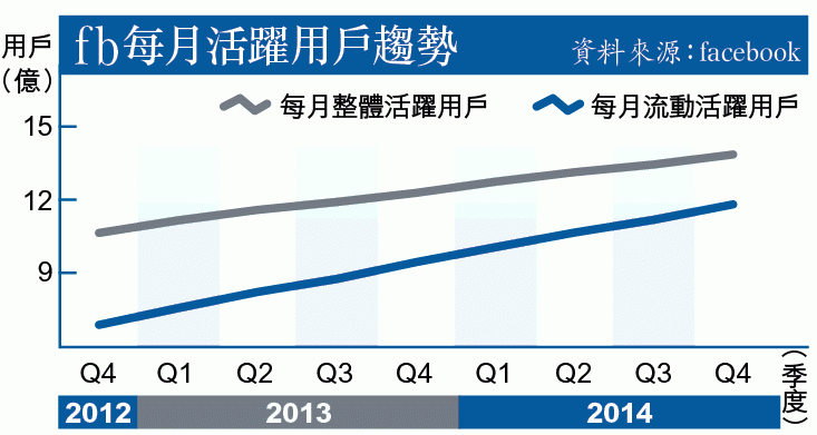 市場研究公司eMarketer估計,fb去年在四百億美元的流動廣告市場市佔率達18.4%,較二○一三年的16.6%為高;相反競爭對手Google則由二○一三年的46.6%,下跌至40.5%。雖然被fb視為用戶「忠誠度」的DAU佔MAU比率,上季僅64%,與前一季相同;但來自每個月用戶的廣告收入由前一年同期的二點一四美元,增31%至二點八一美元。fb上季收入三十八點五一億美元,按年增49%。