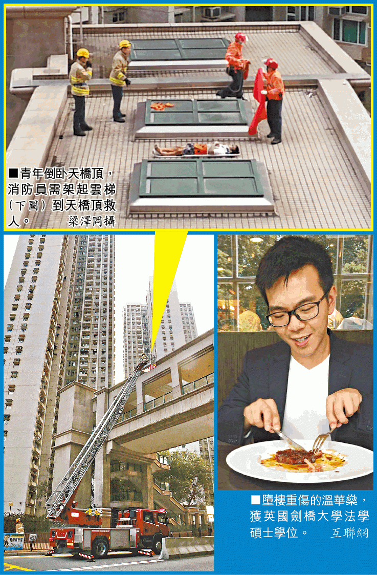 【本報訊】二十四歲青年在英國劍橋大學取得法學碩士學位後,去年返港即入讀香港大學法學專業證書課程(Postgraduate Certificate in Laws, PCLL),立志在港加入律師行列,可惜因為難抵學業壓力,昨晨返回學校考試途中,在將軍澳新都城平台跳落天橋頂身受重傷,脊椎骨折恐有癱瘓之虞。港大法律學院首席講師張達明承認PCLL課程有壓力,每年取錄三百多名PCLL學生,半成至一成初次考試不及格,但他指學生毋須過份憂慮,港大有補考制度及心理輔導資源。