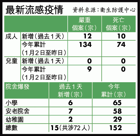 此外,昨再添兩間幼稚園、六間小學及七間安老院舍爆發流感,共涉及七十二人。小欖醫院、沙田醫院及九龍醫院亦有病房爆發流感,共涉及十八名病人,相關病房已停收新症。青山醫院則有一名職員出現流感徵狀。
