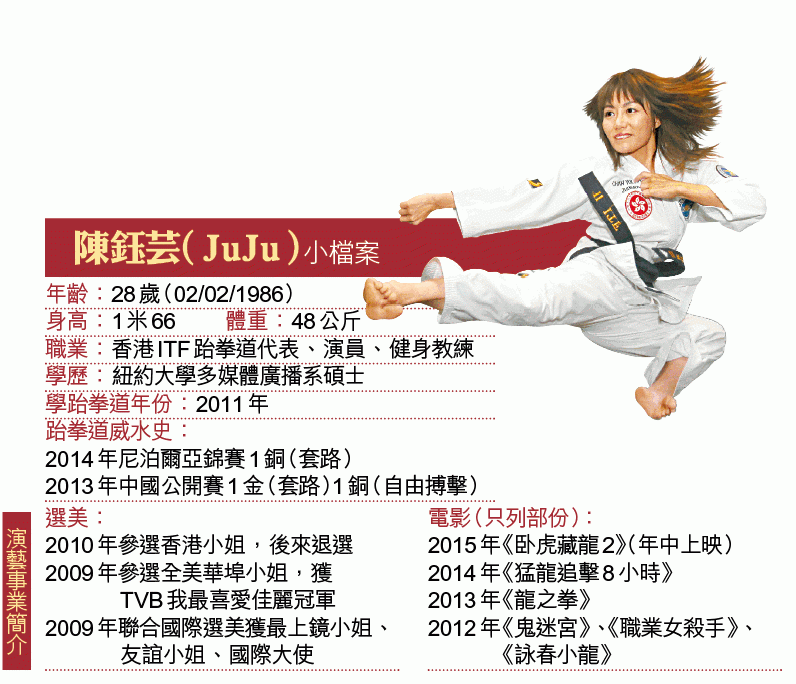 剛簽荷李活新經理人演藝公司的JuJu,現身在美國參加藝訓班;她希望演藝及跆拳道雙線發展。今夏,她將忙個不停,先是袁和平執導的《卧虎藏龍2》今年中在美國上演,JuJu在電影中扮演四大武林高手之一,而八月就要到保加利亞參加ITF世界錦標賽(四十六公斤以下)。她說:「世錦賽個個都是高手,我希望比上次(二○一三年)世錦賽入十六強的成績好一點已滿足了。」