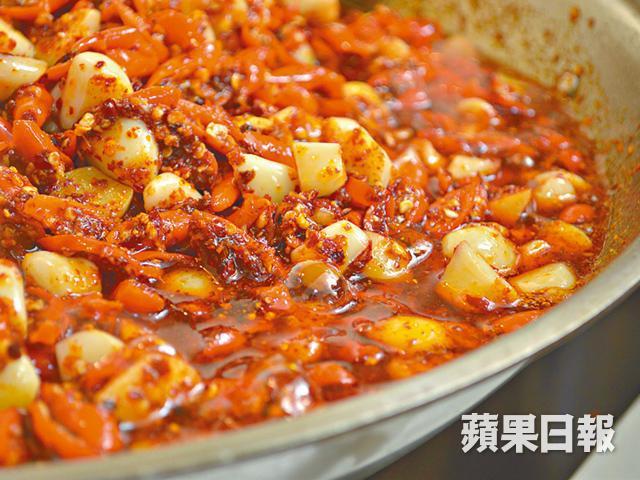 不只材料,炒製過程亦非常麻煩,每次炒醬她都如臨大敵。Karen:「我只會在餐廳休息日才炒,因為一室都是辣味!炒的時候我還會做好安全措施,要戴口罩、眼罩,連耳塞都戴上,不然那陣辣氣攻入耳孔怪不舒服的!」炒的工夫不多,講究的是心機,必須用慢火,油溫不可太高,否則辣椒一下油便熟了便炸不出香氣來,下料以後還要炒炒炒炒炒,一刻不能停,不然辣椒一黏底焦了,便有苦味,一整鍋辣醬便全部要不得,前功盡費了。這樣的心機,每樽麻辣口水汁才賣四十六元,我說不貴,Karen:「反正餐廳也會用到,多做一點賣給人而已。」