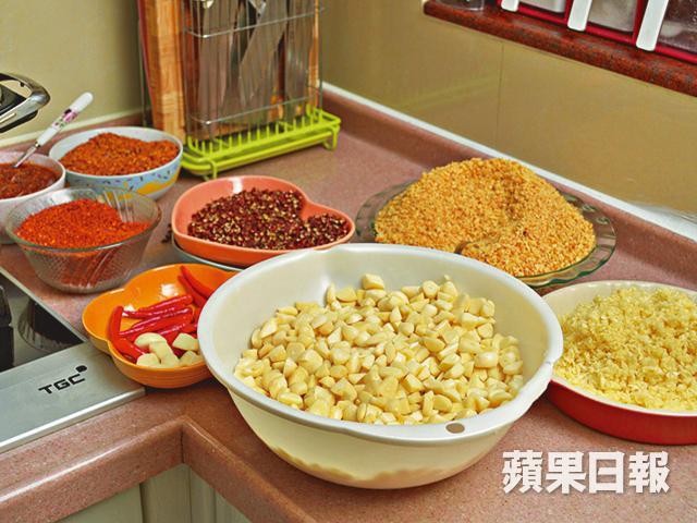 當中的秘密,原來在於一隻雞。「因為我家是做家禽批發生意的,所以做醬的時候我會用上新鮮雞,先焗香雞,撇走過多臊氣的雞油,然後把雞放入油煮,讓油都吸盡雞的香氣。」Karen說道。雞的份量一點不吝嗇,平均每十樽醬便用上一整隻新鮮雞,我笑她是以本傷人,她笑她是善用自己優勢。其他材料,她亦用得考究,大部份辣椒香料,都是每個月親身到四川採購的,子彈椒、燈籠椒、四川辣椒、青紅花椒都是。她指一指枱上花椒,紅綠分明,「在香港買到的很多都是啡色的,就是放得太久了,香味亦大減。」用的材料亦繁多,各種香料辣椒加起來共十八種,難怪味道豐富有層次。