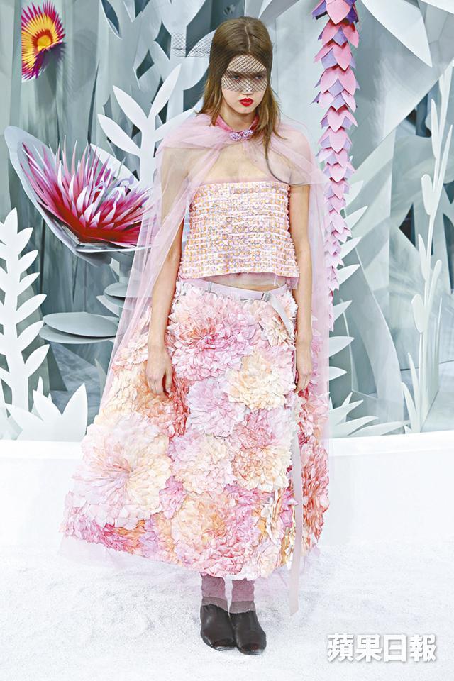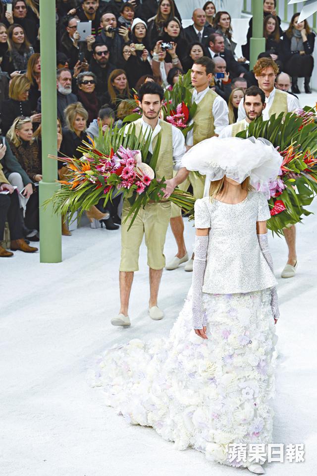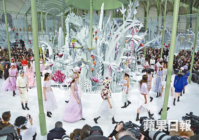 Chanel於香港時間大前日在巴黎主場大皇宮內,將春夏高訂騷場變成圓形溫室,中央是個巨型電動紙雕花叢,精緻佈景已露出春夏系列的端倪。當幾個男模扮園丁,拿着雙C標誌的水桶假裝為花叢澆水,瞬間百花盛放,揭開高訂騷序幕。