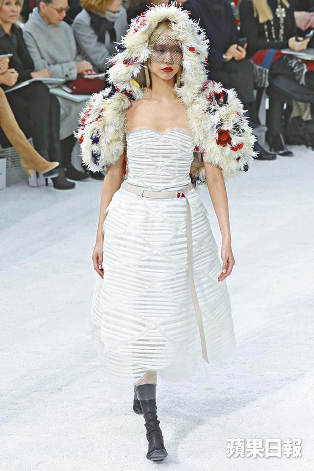 Chanel這個高訂騷上,女模清一色配上黑色平底短靴,最搶眼的配飾是貫穿整個系列的黑紗圓草帽及花花羽毛釘飾織帽。大圓帽甚有巴黎淑女本色,神秘感十足,冷織帽就多為粉色,綻放甜美魅力。