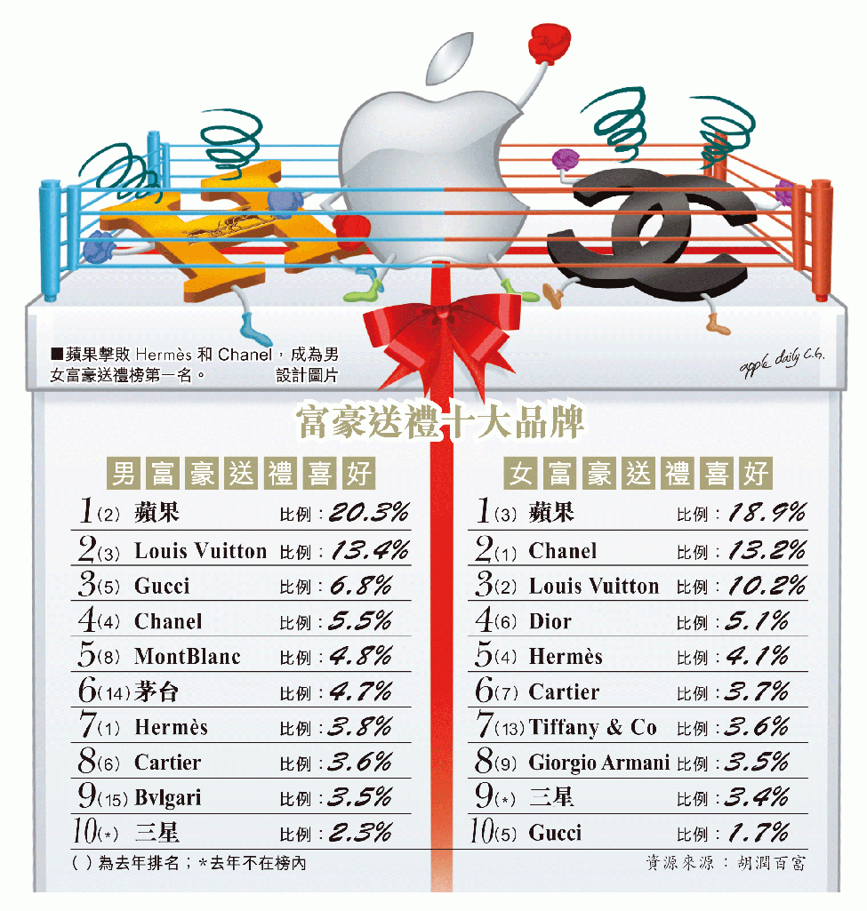 報告指內地大力打貪下,富豪都不敢再買貴價奢侈品,轉為實用為主,送禮使費兩年累跌三成。如此情況下,去年的男富豪送禮榜首Hermès今年顯得黯然失色,一口氣下跌至第七位,被去年排第二的蘋果取代,幾乎每五個男富豪就有一個今年會選擇蘋果產品作為禮物;女富豪榜方面,蟬聯多年的送禮首選Chanel今年跌至第二位,同被蘋果取代,有18.9%女富豪選擇它為送禮首選;Tiffany & Co.的飾品亦從去年的第十三名躍升至今年的第七名,成為女富豪新寵。另一個手機品牌三星今年亦首次進入富豪十大送禮榜,分別進駐男性榜的第十位及女性榜的第九位。Louis Vuitton(LV)剛是連續第九年位列兩性榜前三名,表現相對穩定,而唯一的中國品牌則是貴州茅台,闊別十大榜兩年,今年回歸男富豪送禮榜第六位。