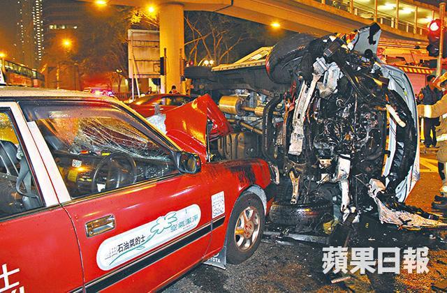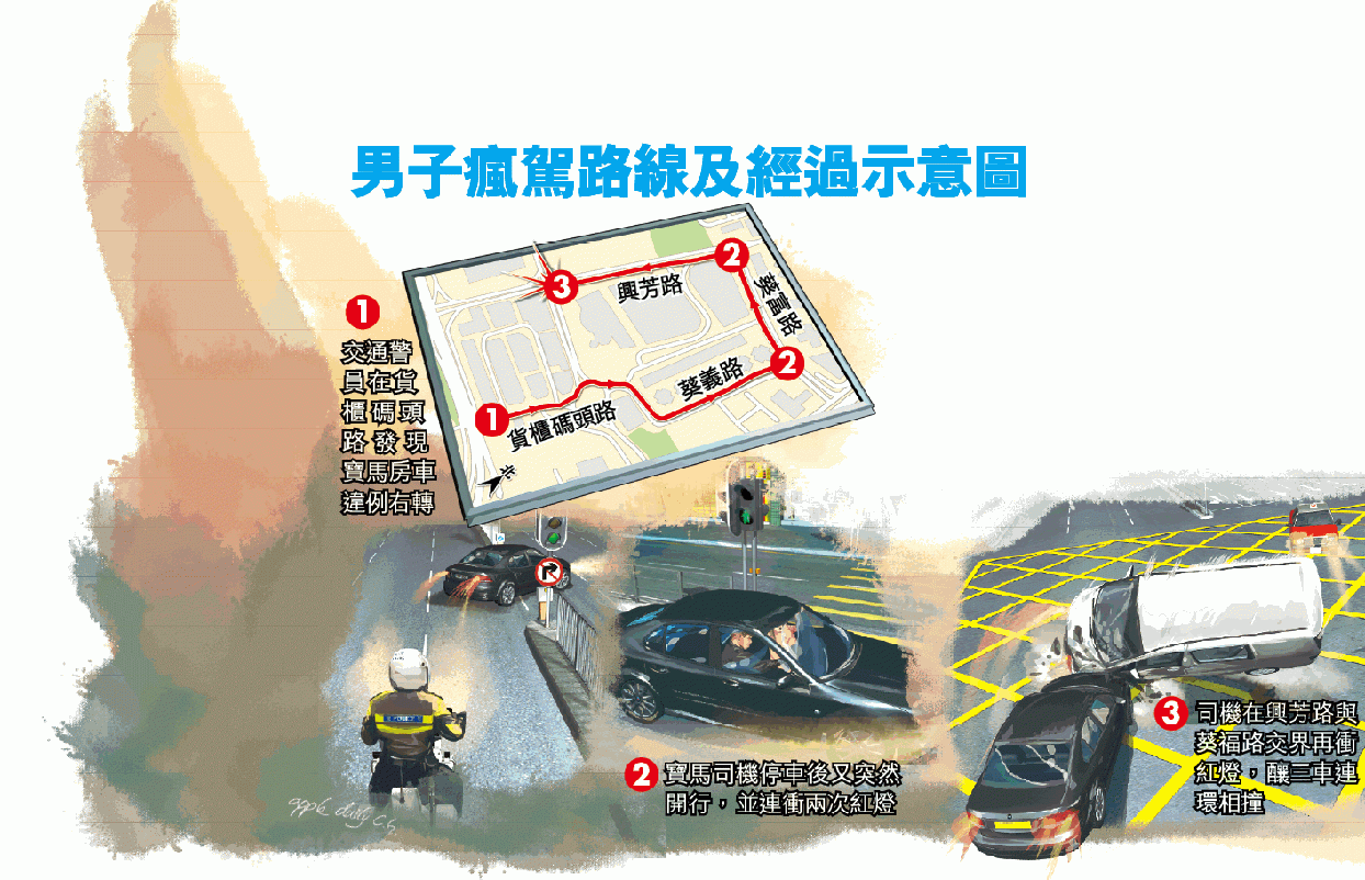【本報訊】男子揸大膽車,深宵駕寶馬房車接載女伴,因違例右轉被巡警追截。他衝紅燈飆車一點一公里,至葵涌興芳路與葵福路交界再衝紅燈時失事,導致三車相撞,撞翻一輛客貨車後才停下,五人受傷。無牌司機一度送入深切治療部,他涉瘋狂駕駛等多項罪名被捕。
