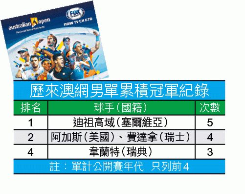 今屆開打前,迪祖與費達拿及美國名宿阿加斯同樣累積四屆冠軍,共同保持公開賽年代的澳網男單紀錄;經過昨日一役,迪祖成功獨霸紀錄,榮膺「澳網之王」(見附表)。相反,今仗惜敗的梅禮延續悲慘紀錄,歷來四次殺入澳網決賽都只屈居亞軍,其中三次更敗於迪祖拍下。